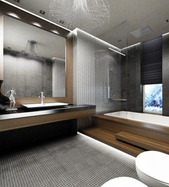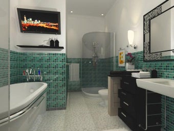 Jeśli masz dużą łazienkę, nadal możesz wykorzystać podłogę, ścianę i lustro. Ale będziesz musiał dodać do pokoju kilka innych elementów, żeby wyglądał większy.